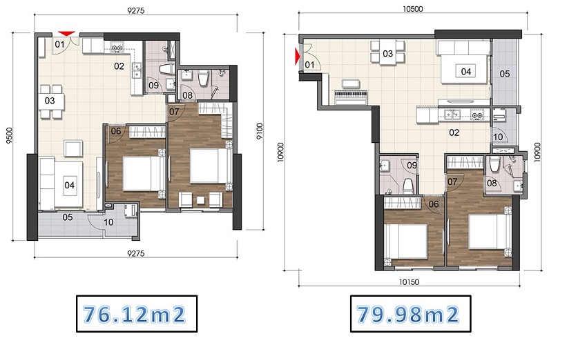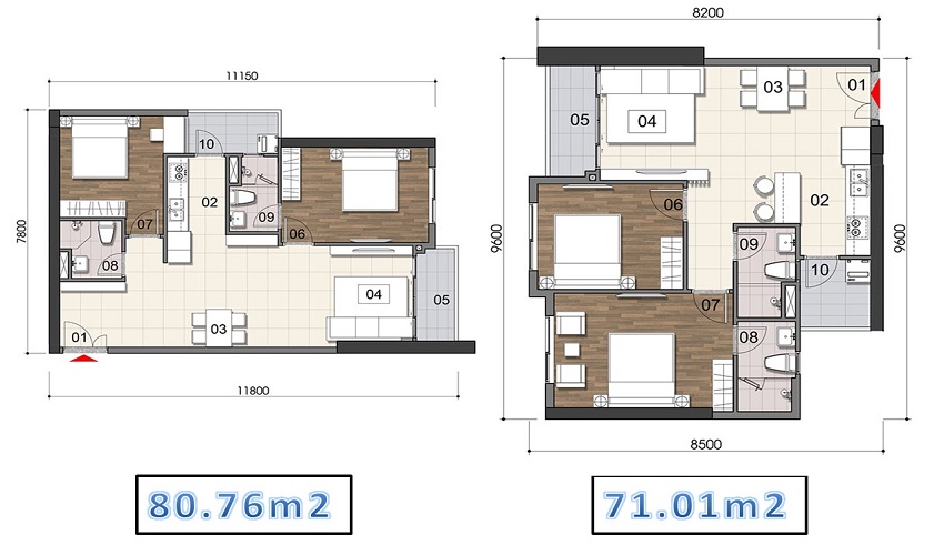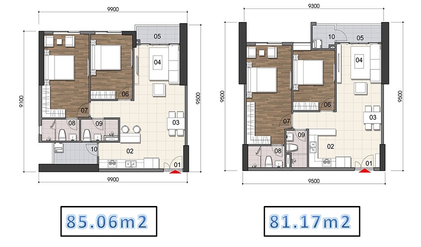 – Căn 2 phòng ngủ: 71.01m2 – 85.06m2