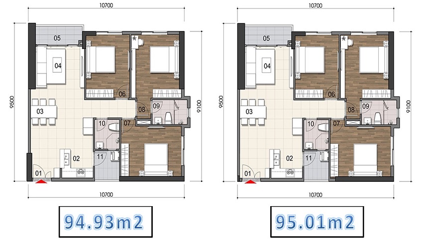 – Căn 3 phòng ngủ: 94.83m2 – 95.01m2