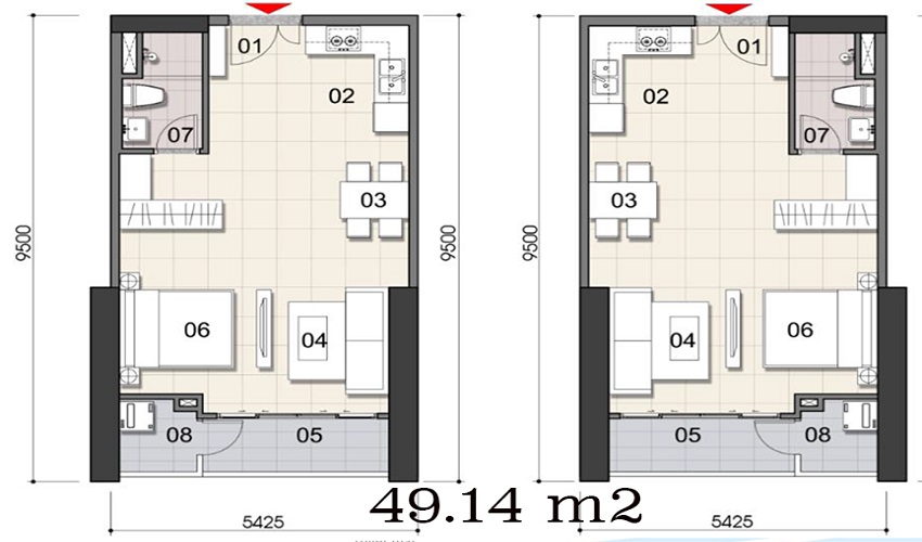 – Căn 1 phòng ngủ: 49.14m2